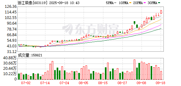 浙江荣泰股价再创历史新高,该股近期呈不断突破新高之势,近一个月累计有13个交易日股价刷新历史纪录。截至09:34,该股目前上涨6.90%优优配送版,股价报114.50元,成交439.74万股,成交金额4.96亿元,换手率2.16%,该股最新A股总市值达416.48亿元,该股A股流通市值233.44亿元。
