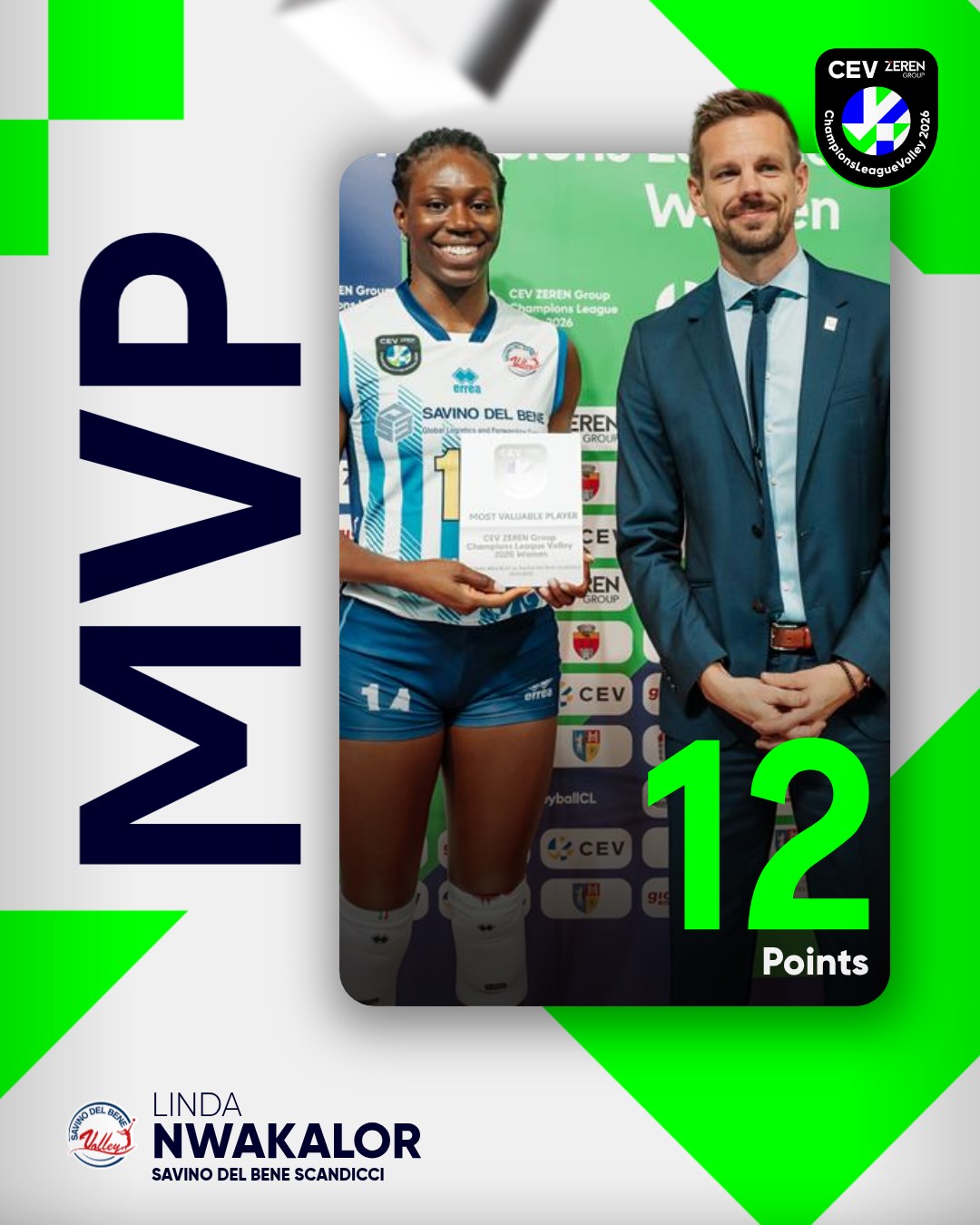 本场比赛,斯坎迪奇打出全队51%的扣球成功率,拦网更是表现抢眼,全队共贡献13次拦网。其中,意大利国家队23岁副攻琳达·恩瓦卡洛,斩获12分(3扣2中10拦),其中独揽10次拦网得分,成为当场MVP。她的拦网表现已接近欧冠女排单场拦网12分的纪录,展现其顶尖副攻的实力。
